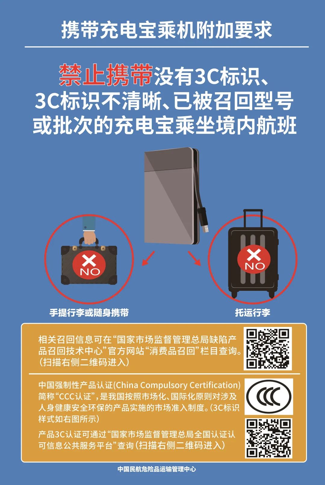 日前,为切实保障航空运行安全,民航局发布紧急通知,自6月28日起禁止旅客携带没有3C标识、3C标识不清晰、被召回型号或批次的充电宝乘坐境内航班。